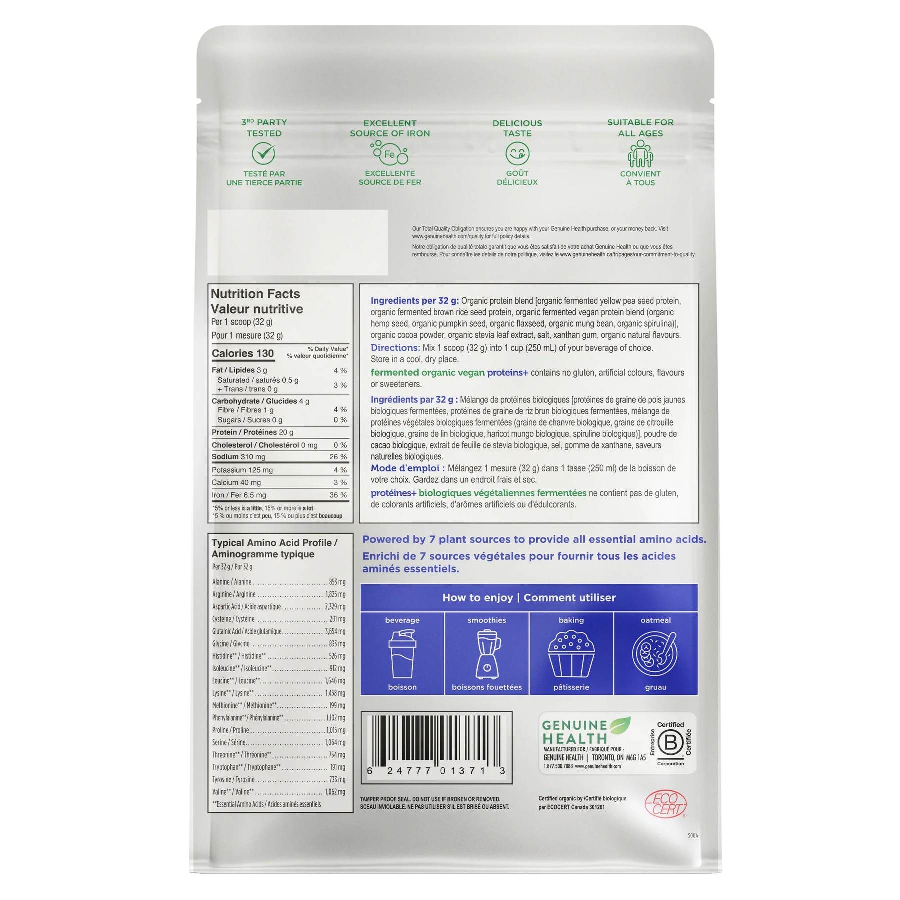 A balanced amino acid profile from 7 organic plant-based sources: organic spirulina, organic mung bean, organic yellow pea kernel, organic pumpkin, organic flaxseed, organic hemp and organic brown rice.