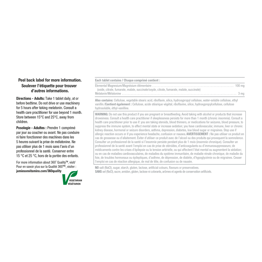 Jamieson Magnesium Night is a unique nighttime formula delivers 100 mg of magnesium to support muscle function, along with 3 mg of melatonin to help promote a longer lasting, better quality sleep.