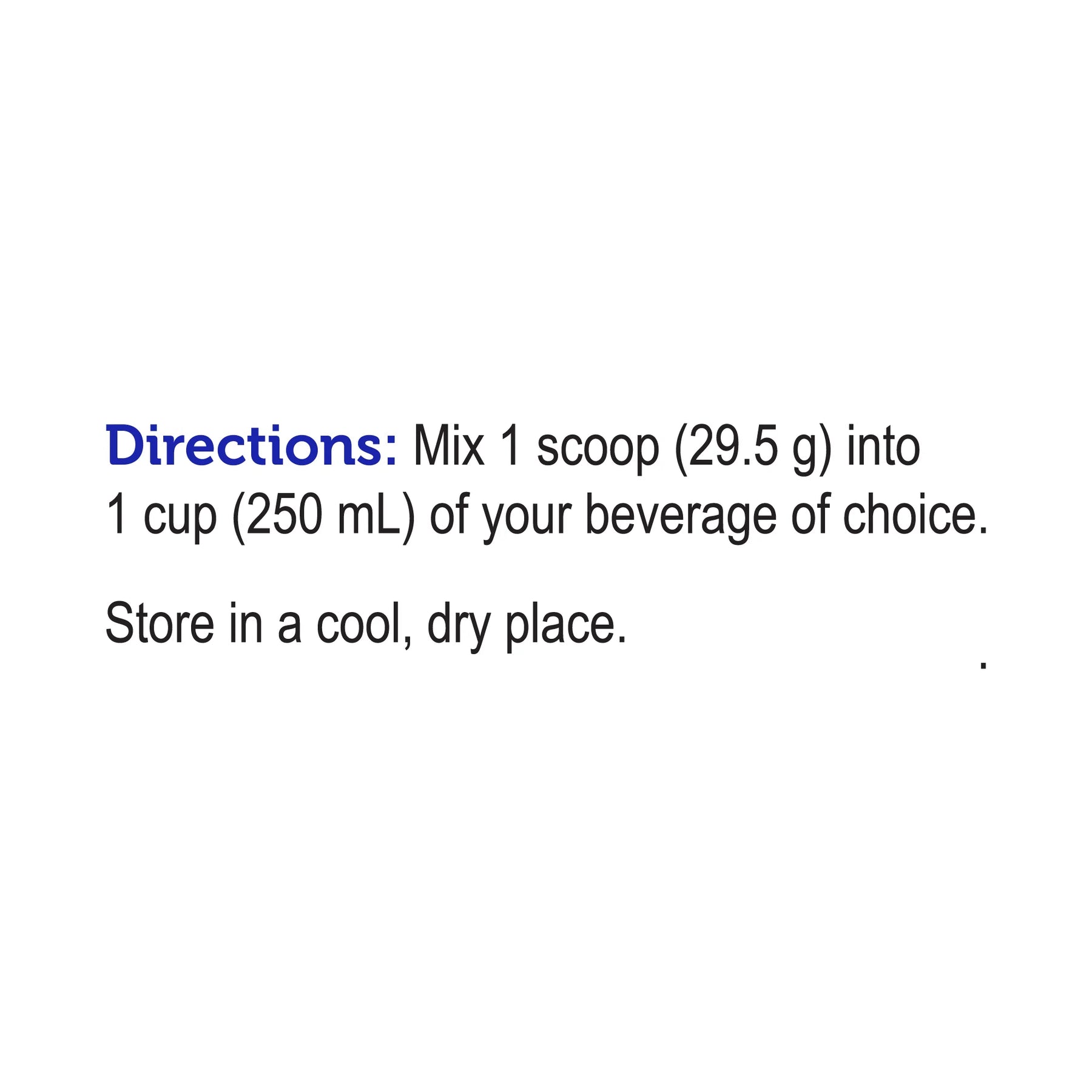 Mix 1 scoop (30 g) into 1 cup (250mL) of your beverage of choice. Store in a cool, dry place.