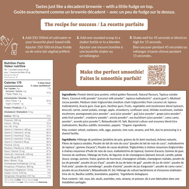 Protein blend (pea protein, milled golden flaxseed), Natural flavours, Tapioca soluble fibers, Coconut milk powder* (coconut milk powder*, tapioca maltodextrin*, acacia gum*), Alkalized cocoa powder, Medium chain triglycerides (medium chain triglycerides from coconut oil, tapioca maltodextrin), Acacia gum, Guar gum, Xanthan gum, Fruits, vegetables and mushrooms blend (spinach, broccoli, carrot, sweet potato, orange, apple, strawberry, sunflower seed, shiitake mushroom, maitake mushroom, pomegranate juice powder*, acai juice powder*, goji juice powder*, grape juice powder*, amla fruit powder*, cranberry powder*, aronia powder*, sea buckthorn juice powder*, camu camu powder*, acerola juice powder*), Rebaudioside M, Salt, Bacterial culture and enzymes blend (rice maltodextrin, Bacillus subtilis, bromelain, papain).*Organic ingredients