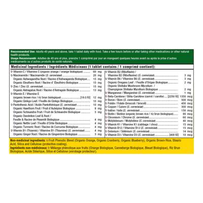 Herbal & Food-State Blend: Organic Eleuthero root, Organic Ashwagandha root, Organic Astragalus root, Organic Ginkgo leaf, Organic Hawthorn berry, Fruit Phenolic Blend (organic orange, organic cranberry, organic blueberry), Organic Schisandra berry, Organic Nettle leaf, Organic Turmeric root, Organic Ginger root, Organic Dandelion leaf and root, Organic Oregano leaf, Shiitake mycelium.