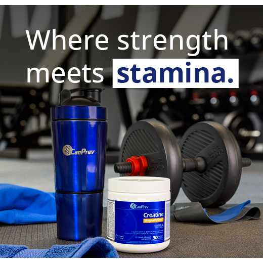 CanPrev’s Creatine MagnaPower® includes 4.4g of creatine and 200 mg of magnesium per serving, delivered in a delicious Peach-Mango flavoured powder that is easy to throw in your shaker cup. This blend combines creatine monohydrate and Creatine MagnaPower®, a type of creatine that’s bound to magnesium. This chemical bond enhances creatine absorption, helping to impact cellular energy, which may result in strength gains and enhanced athletic performance. Also available in an unflavoured powder.