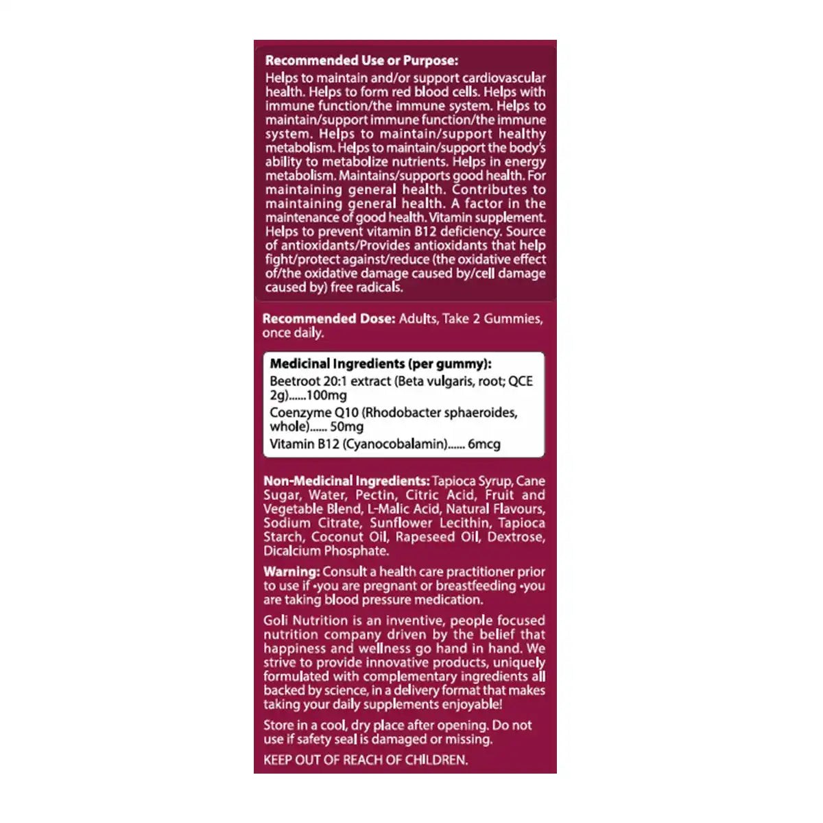 Beetroot 20:1 extract (Beta vulgaris, root; QCE 2g) 100mg, Coenzyme Q10 (Rhodobacter sphaeroides, whole) 50mg, Vitamin B12 (Cyanocobalamin) 6mcg